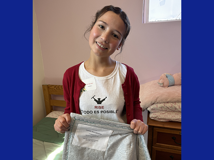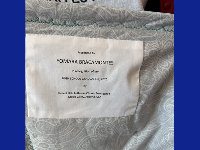 A special award was given to Yomara, who just graduated from high school and enrolled in college. She was given her very own quilt, with her name and year of graduation, made by the Sewing Bee group of Desert Hills Lutheran Church.